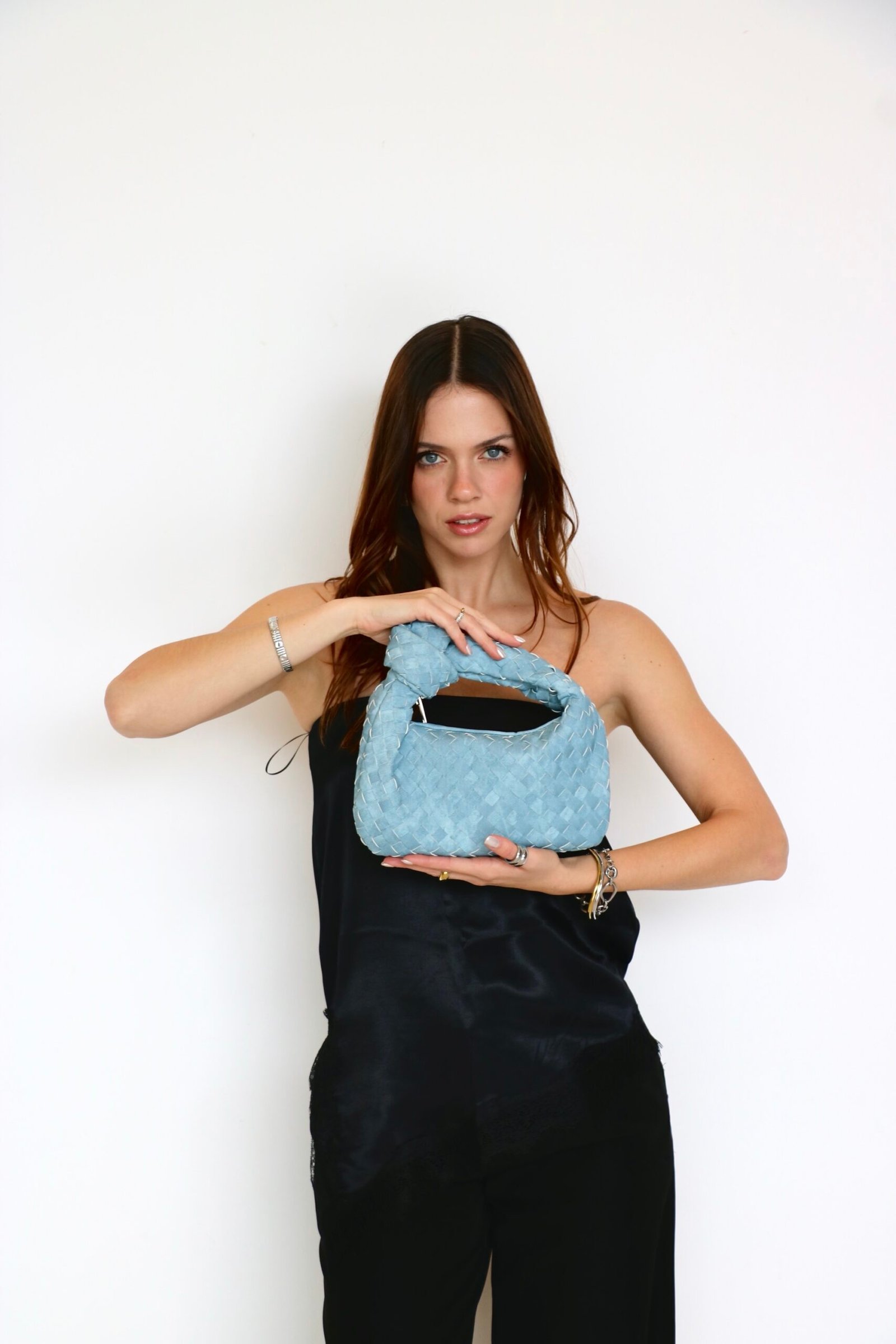BOLSA DE MANO AZUL MEZCLILLA VINIPIEL MEDIANA DIVERSOS COLORES. MEDIDAS: 16 CM X 28 CM